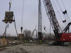 Used two large vibro hammers on 4100 Manitowoc to drive casing through sands and silts from 100-130ft. deep. Two twin diesel drill attachments and a soilmec 625 drill rig were used to socket the shafts into 60,000 PSF hardpan.
